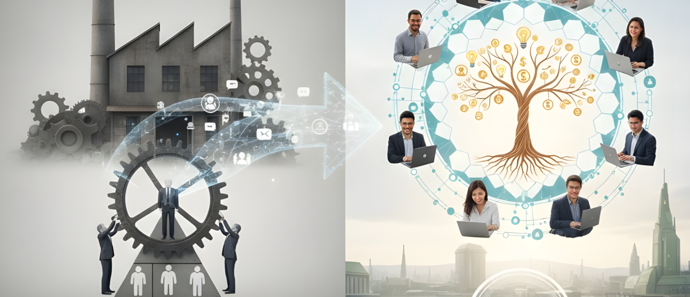 Bild (erstellt mit Midjourney): Wandel von traditionellen zur Community basierten Arbeitswelt